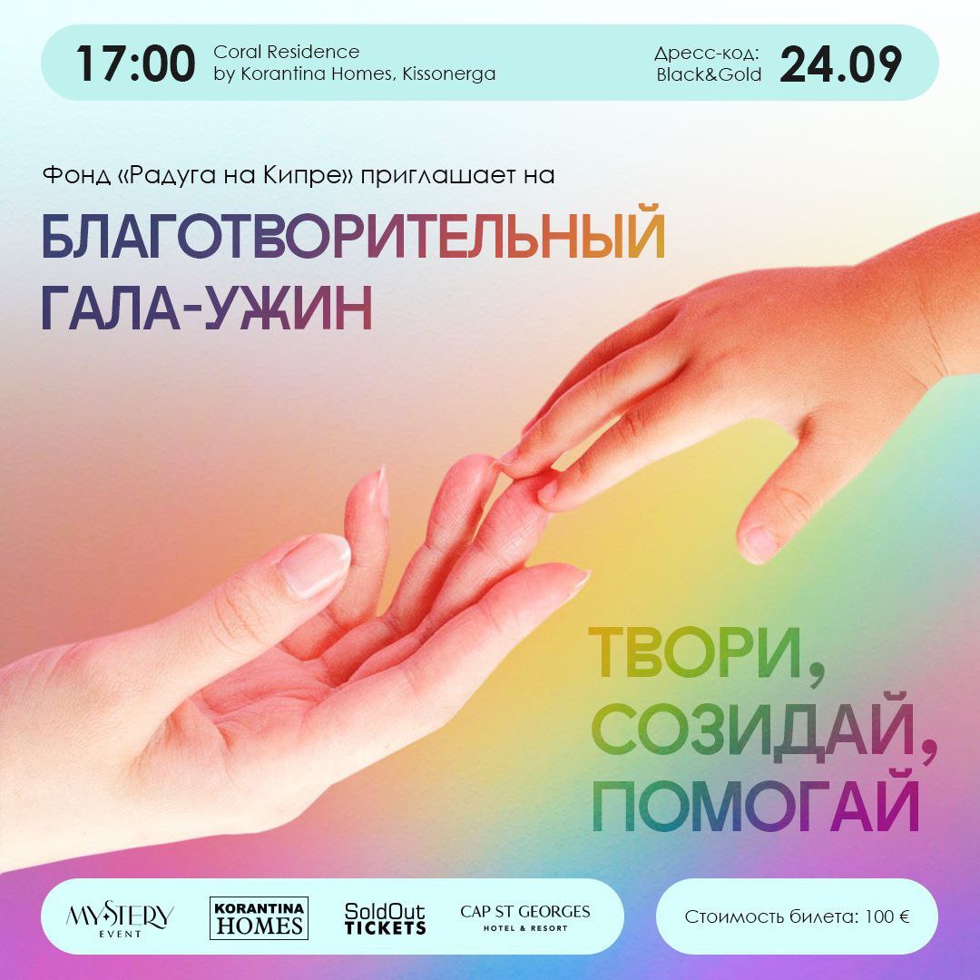 We invite you to a Charity Gala Dinner in honour of the anniversary of our fund, which will be held on the 24th of September at 17:00 at the Coral Residence Cap St Georges (Address: 3, Maniki Street, Peyia 8570, Cyprus).