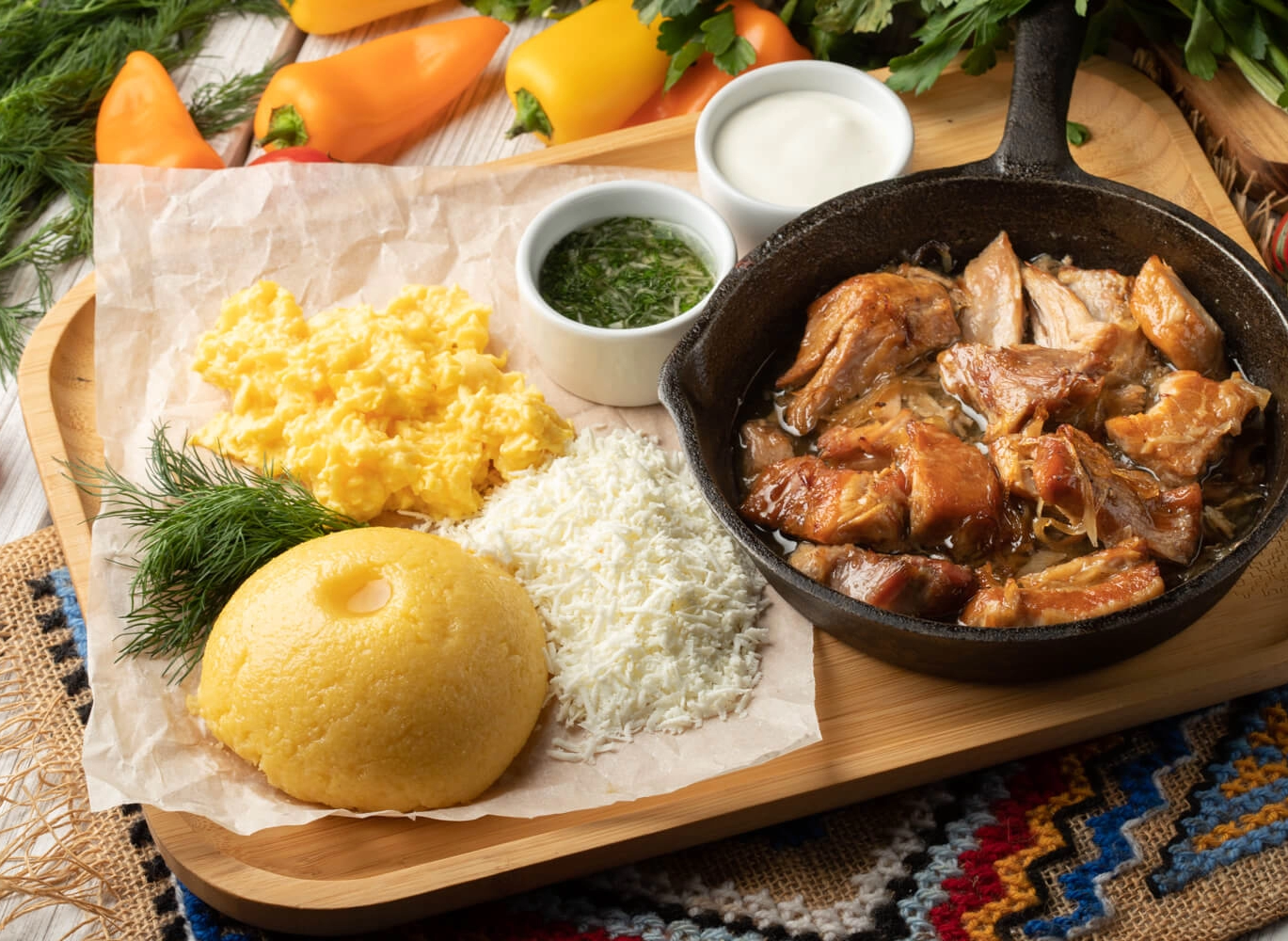 Mamaliga is served with different fillings: scallions, fried meat, sauces, sour cream and bryndza and, of course, the table is traditionally served with red Moldovan wine from authentic vineyards.