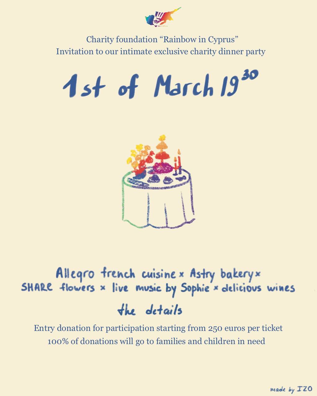 A cosy, unique and sophisticated experience. A dinner created with love and care, to raise funds for a greater cause. Our foundation has helped many families and children to spend an unforgettable moment by the sea in Cyprus. To all of the children of “Rainbow In Cyprus” this holiday is a dream come true, a source for so much needed laughter, kindness and warmth.
