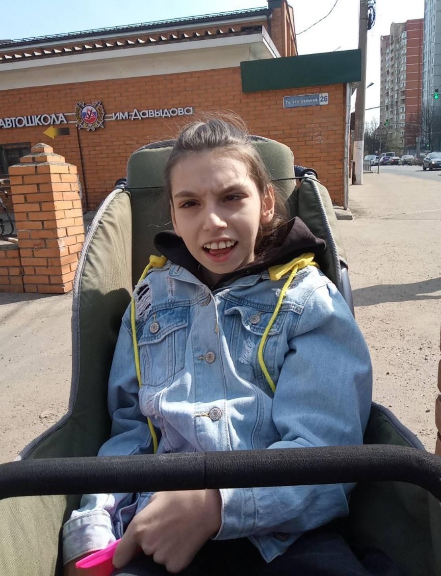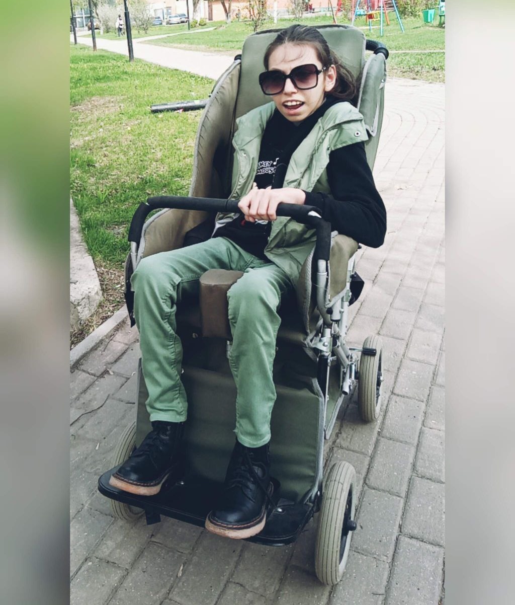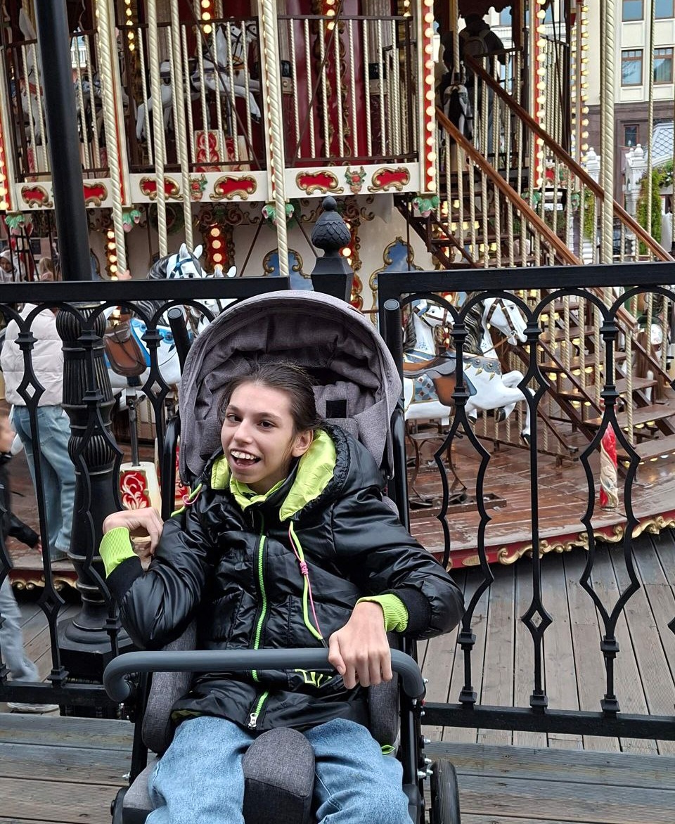 Nastya began to hold her head up at 1 year old, has been using a walker since 2 years old, and can stand with support. Unfortunately, she cannot sit independently, but she amazes everyone with her perfect pitch — she sings, uses YouTube and musical educational aids, which she finds very exciting. From the age of 2 to 14, Nastya attended a special needs nursery and took part in musical events, delighting everyone with her performances — to the best of her ability.